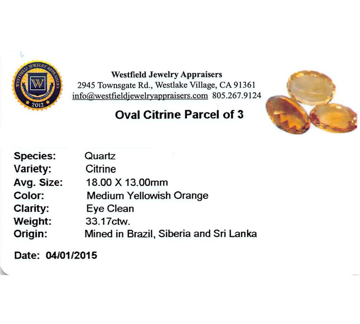 Three oval mixed cut natural citrine quartzs exact total weight 33.17ct., clarity is eye clean, type I, medium, slightly brownish, yellowish orange color, (GIA yO 5/2), cut is good. UGS Appraised.
