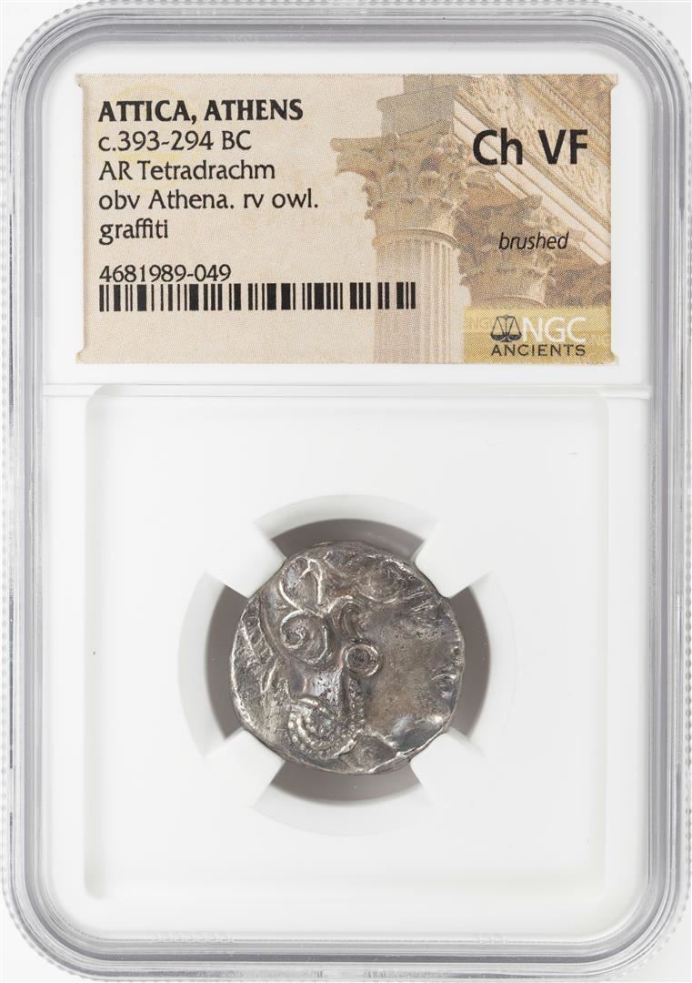 One 393-294 BC Attica Athens AR Tetradrachm Athena Owl Coin NGC CH VF. NGC Certified.