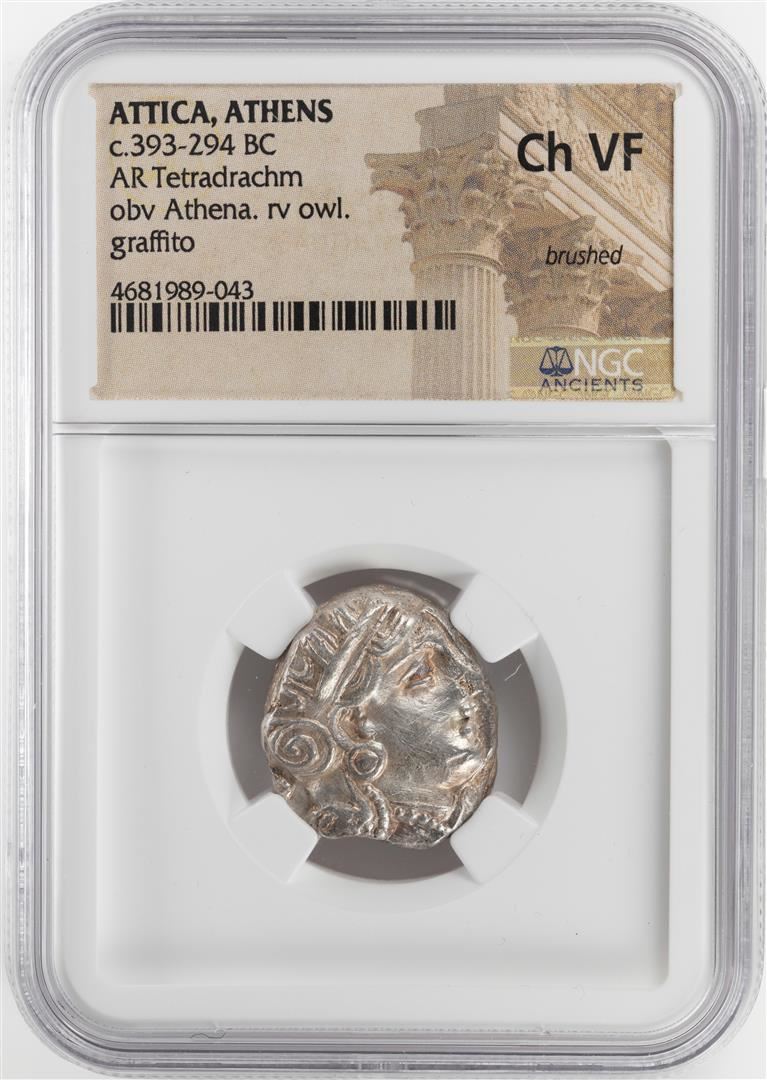 One 393-294 BC Attica Athens AR Tetradrachm Athena Owl Coin NGC CH VF. NGC Certified.