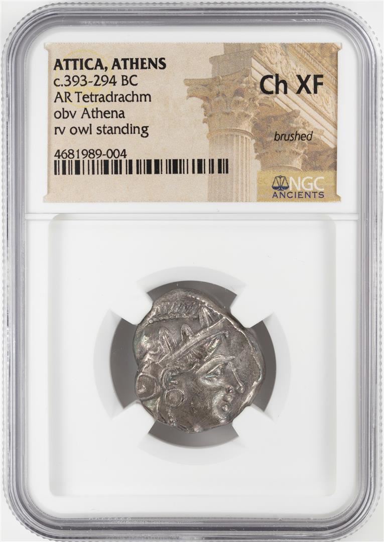 One 393-294 BC Attica Athens AR Tetradrachm Athena Owl Coin NGC CH XF. NGC Certified.