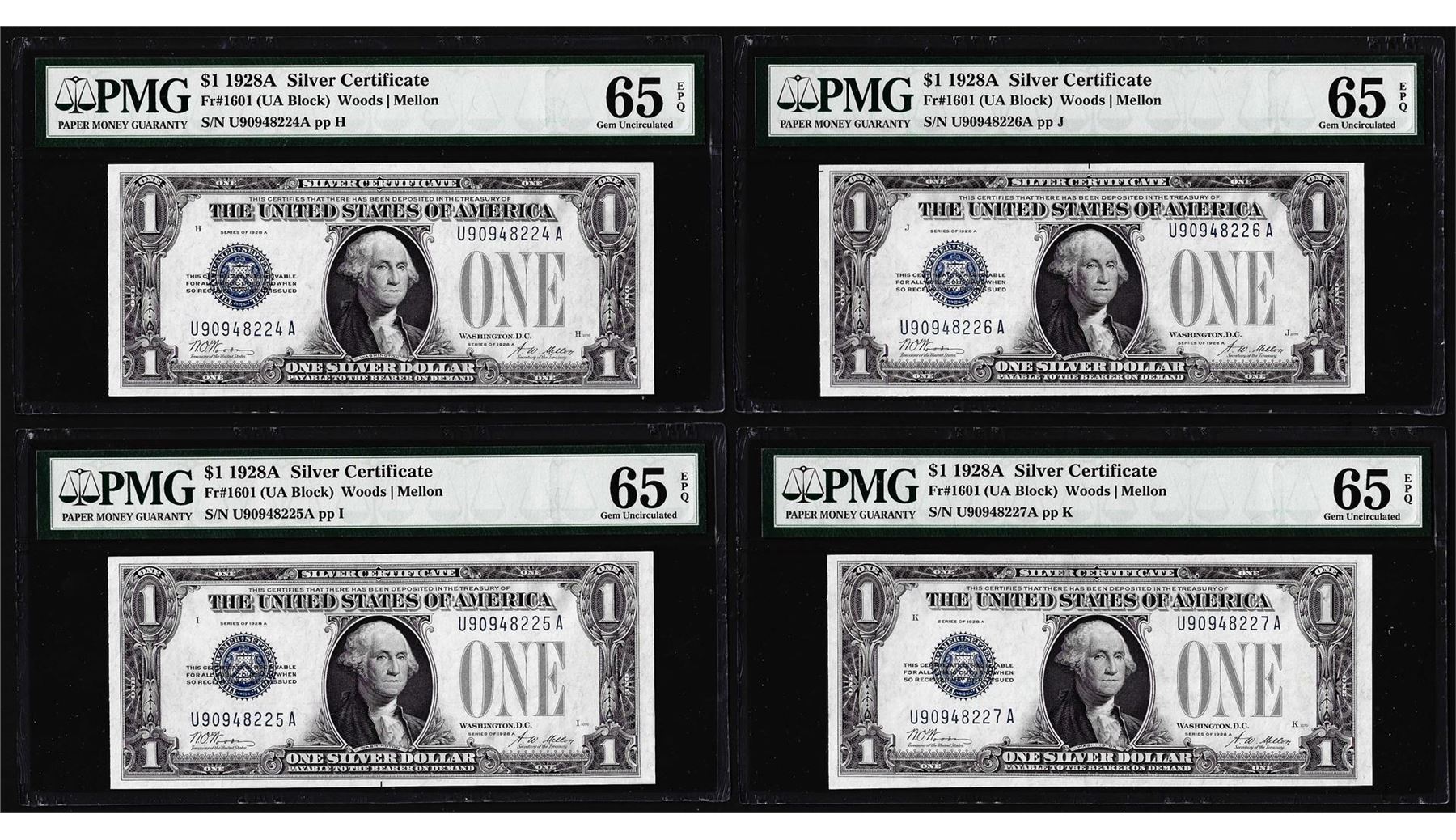 One (4) Consecutive 1928A $1 Silver Certificate Notes Fr.1601 PMG Gem Uncirculated 65EPQ. PMG Certified.