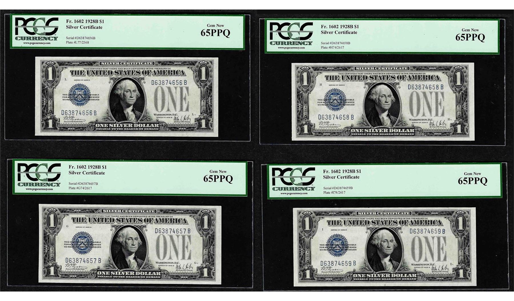 One (4) Consecutive 1928B $1 Funnyback Silver Certificate Notes Fr.1602 PCGS Gem New 65PPQ. PCGS Graded.
