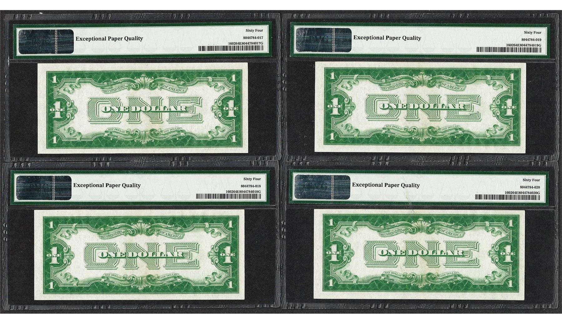 One (4) Consecutive 1928B $1 Funnyback Silver Certificate Notes PMG Choice Unc. 64EPQ. PMG Certified.