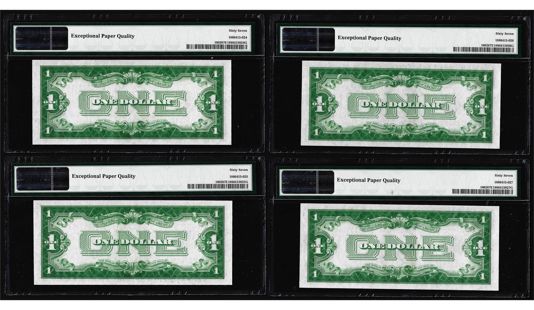 One (4) Consecutive 1928B $1 Silver Certificate Notes Fr.1602 PMG Superb Gem Unc. 67EPQ. PMG Certified.