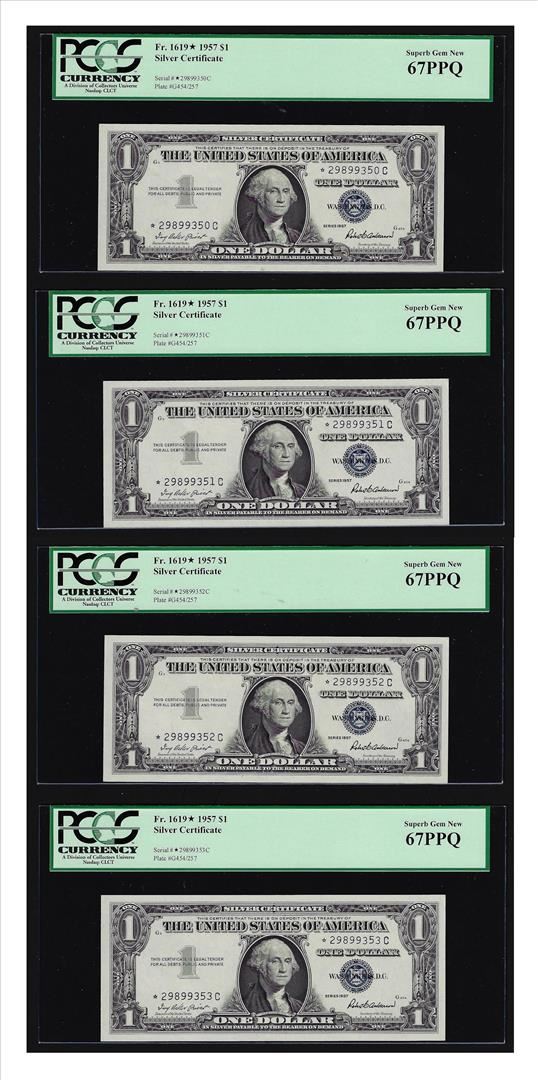 One (4) Sequential 1957 $1 Silver Certificate STAR Notes PCGS Superb Gem New 67PPQ. PCGS Graded.