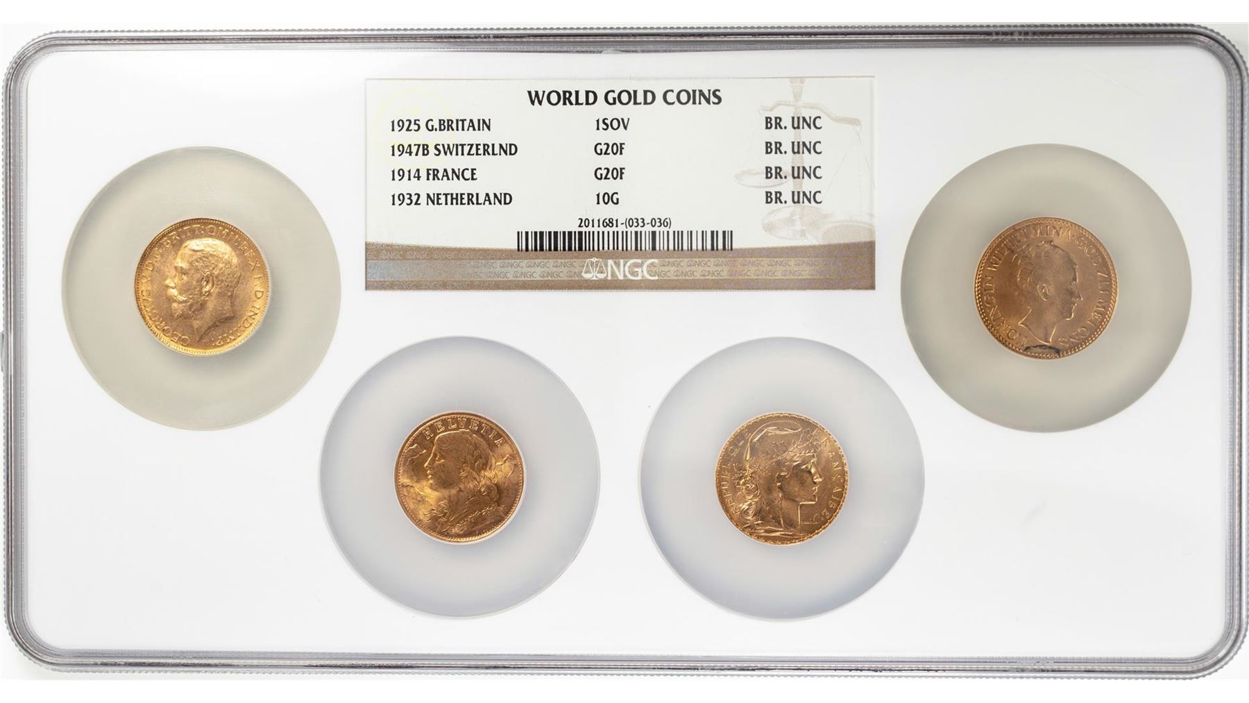 One Lot of (4) World Gold Coins '25 Britain '47 Swiss '14 France '32 Netherland NGC Uncirculated. NGC Certified.