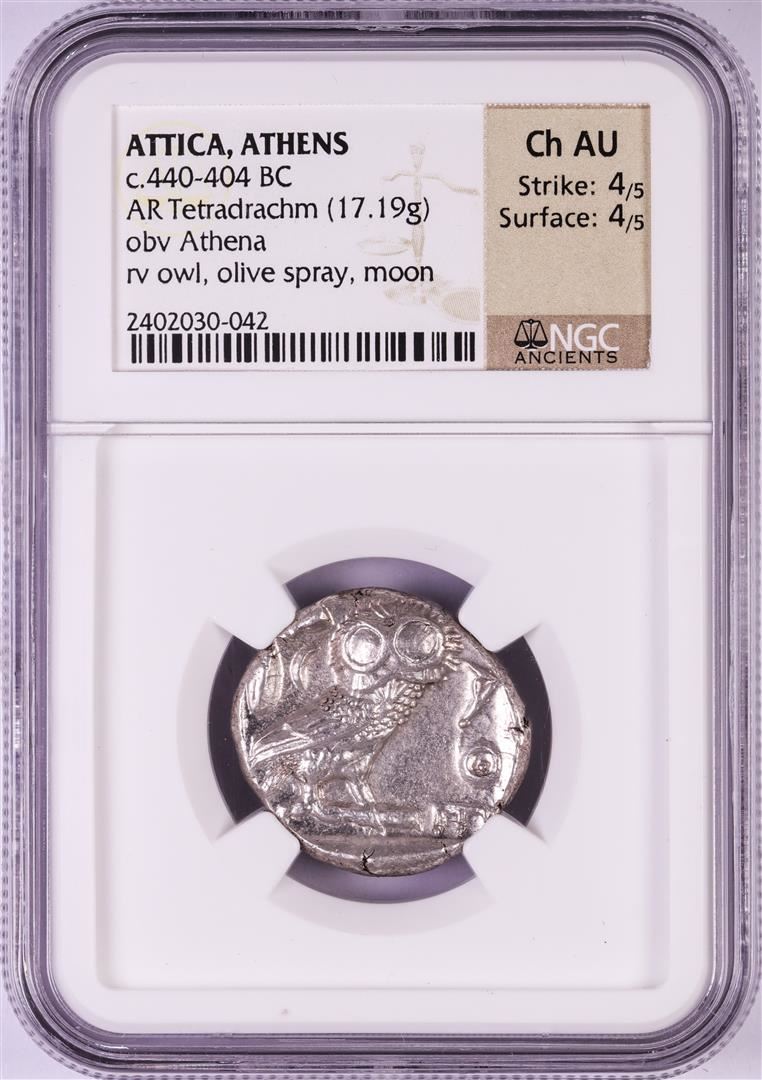 One 440-404 BC Attica Athens AR Tetradrachm Athena Owl Coin NGC Choice AU. NGC Certified.