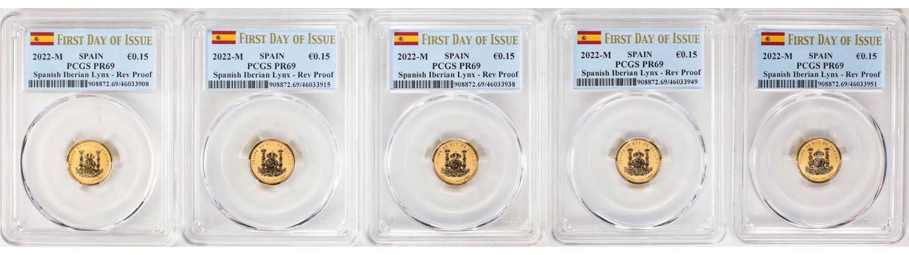 (5) 2022M Spain 15 Euro Cent Reverse Proof Lynx Gold Doubloon Coins PCGS PR69 FDOI