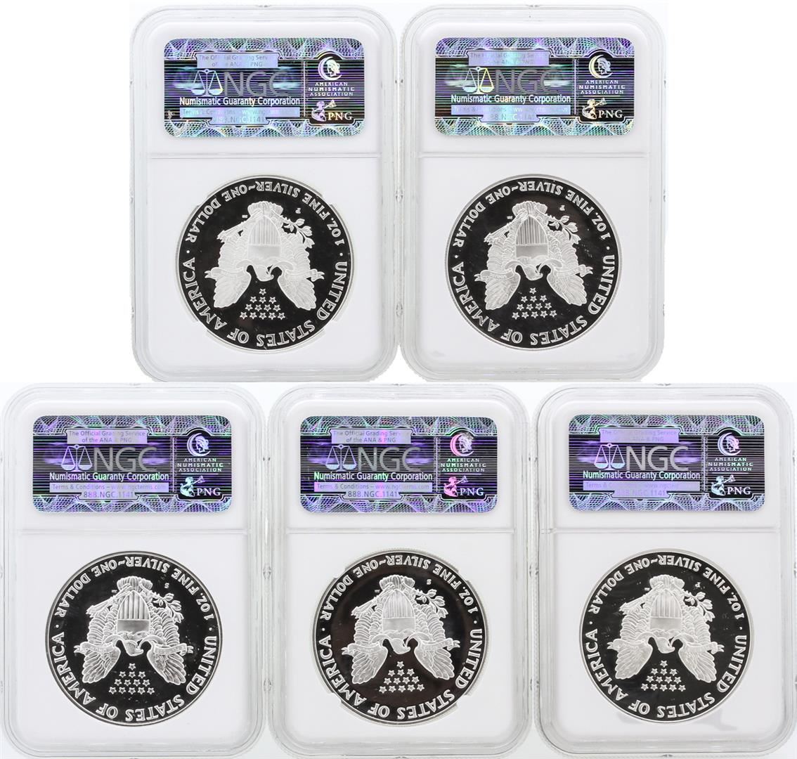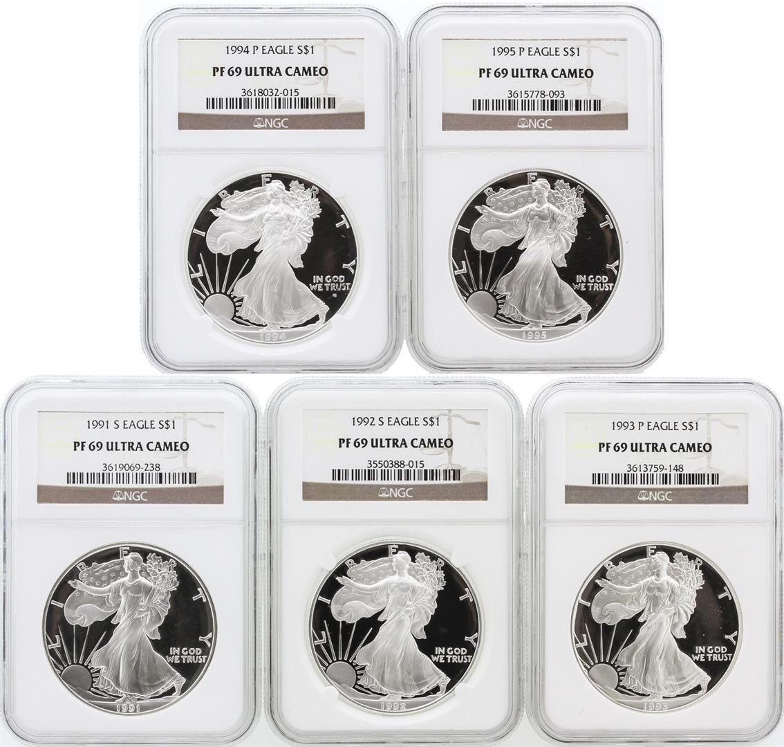 This (5) Coin set includes 1 of each of the following coins: 1991-S Silver Eagle Coin NGC PF 69 Ultra Cameo, 1992-S Silver Eagle Coin NGC PF 69 Ultra Cameo, 1993-P Silver Eagle Coin NGC PF 69 Ultra Cameo, 1994-P Silver Eagle Coin NGC PF 69 Ultra Cameo, and a 1995-P Silver Eagle Coin NGC PF 69 Ultra Cameo. This would make a great start or addition to any collection of U.S. coins. NGC Certified.