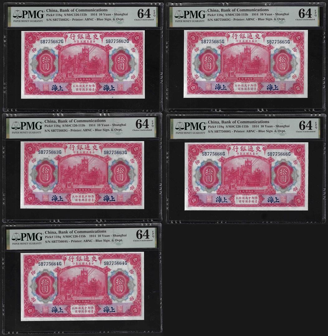 (5) Consecutive 1914 China Bank of Communications 10 Yuan Notes PMG Choice Unc. 64EPQ