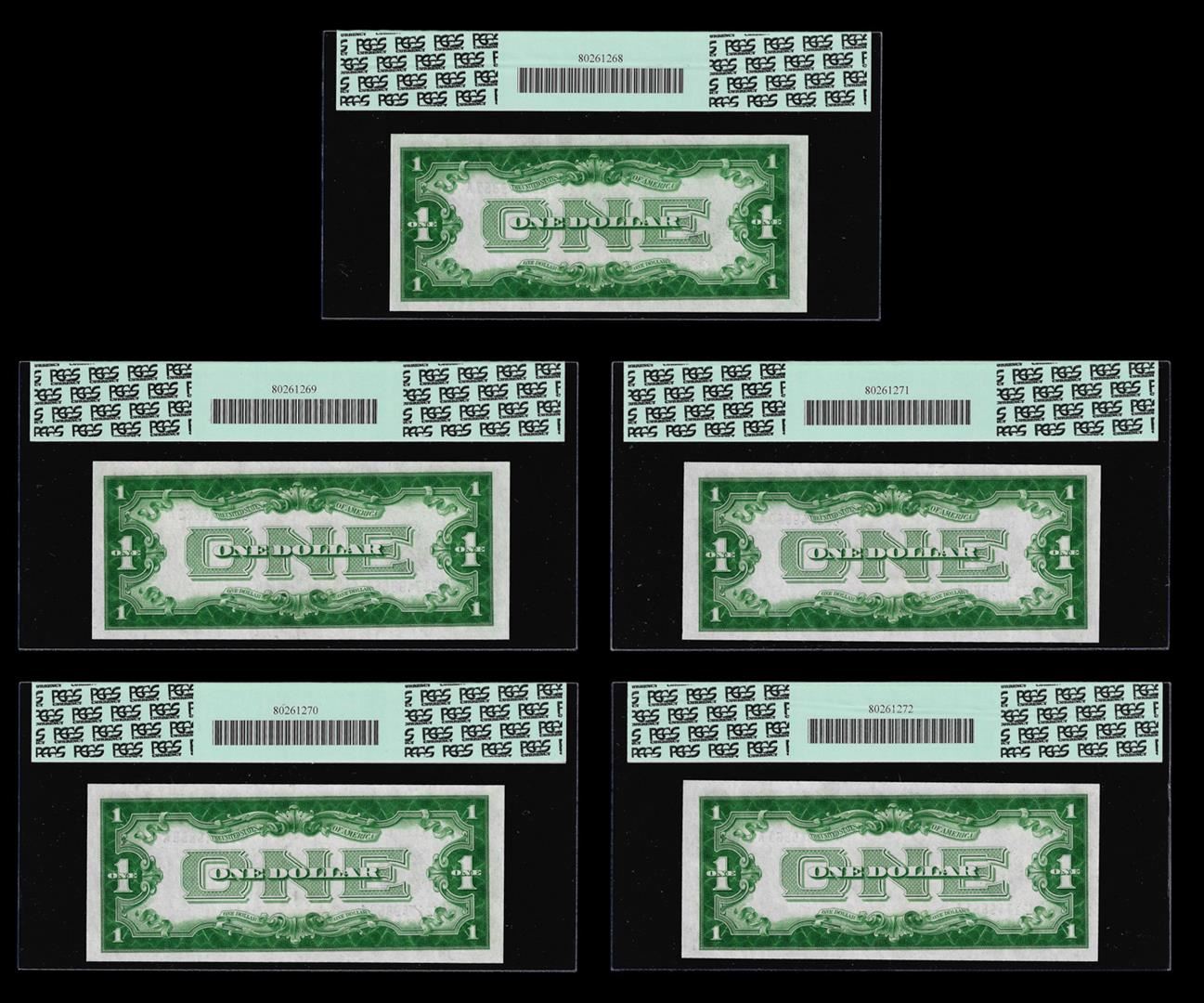 One (5) Consecutive 1928A $1 Funnyback Silver Certificate Notes PCGS Very Choice New 64PPQ. PCGS Graded.