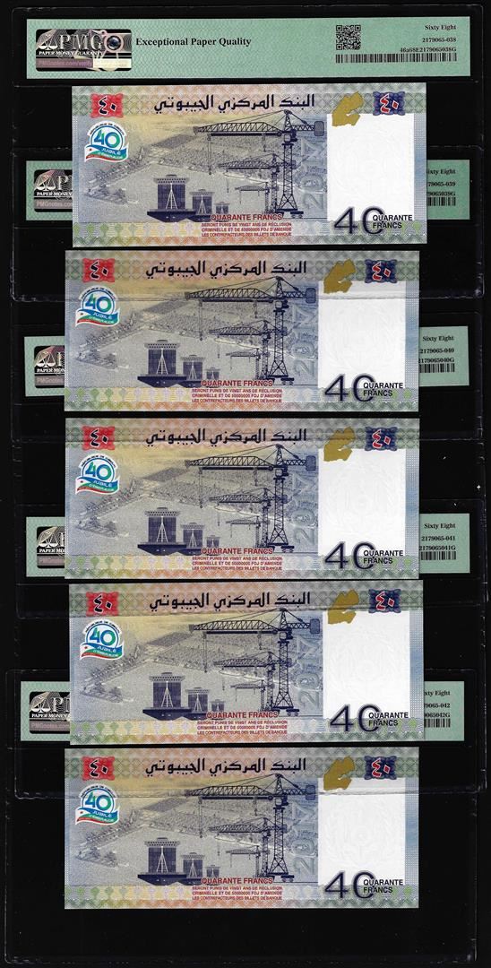 One (5) Consecutive 2017 Djibouti 40 Francs Bank Notes PMG Superb Gem Uncirculated 68EPQ. PMG Certified.