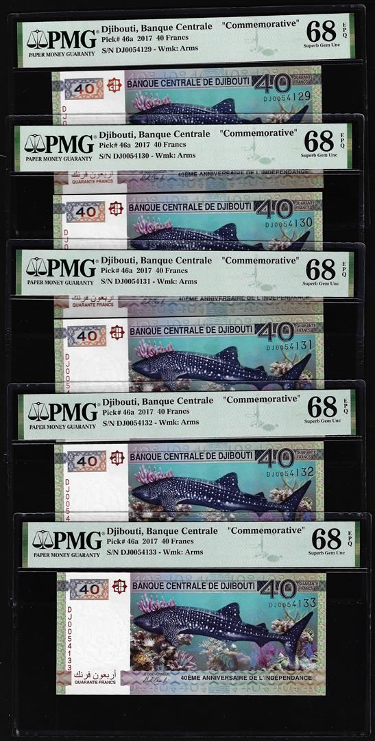 One (5) Consecutive 2017 Djibouti 40 Francs Bank Notes PMG Superb Gem Uncirculated 68EPQ. PMG Certified.