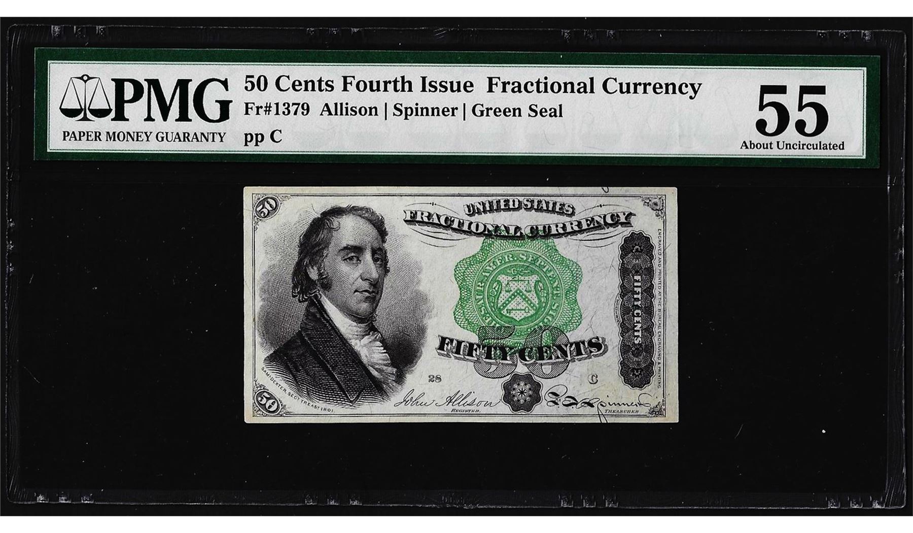 One 50 Cents Fourth Issue Fractional Currency Note Fr.1379 PMG About Uncirculated 55. PMG Certified.