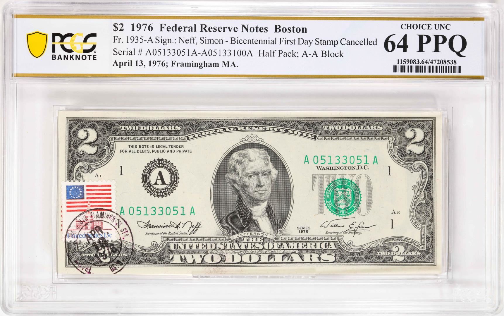 One Half Pack of (50) Consecutive 1976 $2 Federal Reserve Notes First Day Cancelled PCGS Choice Uncirculated 64PPQ. PCGS Graded.