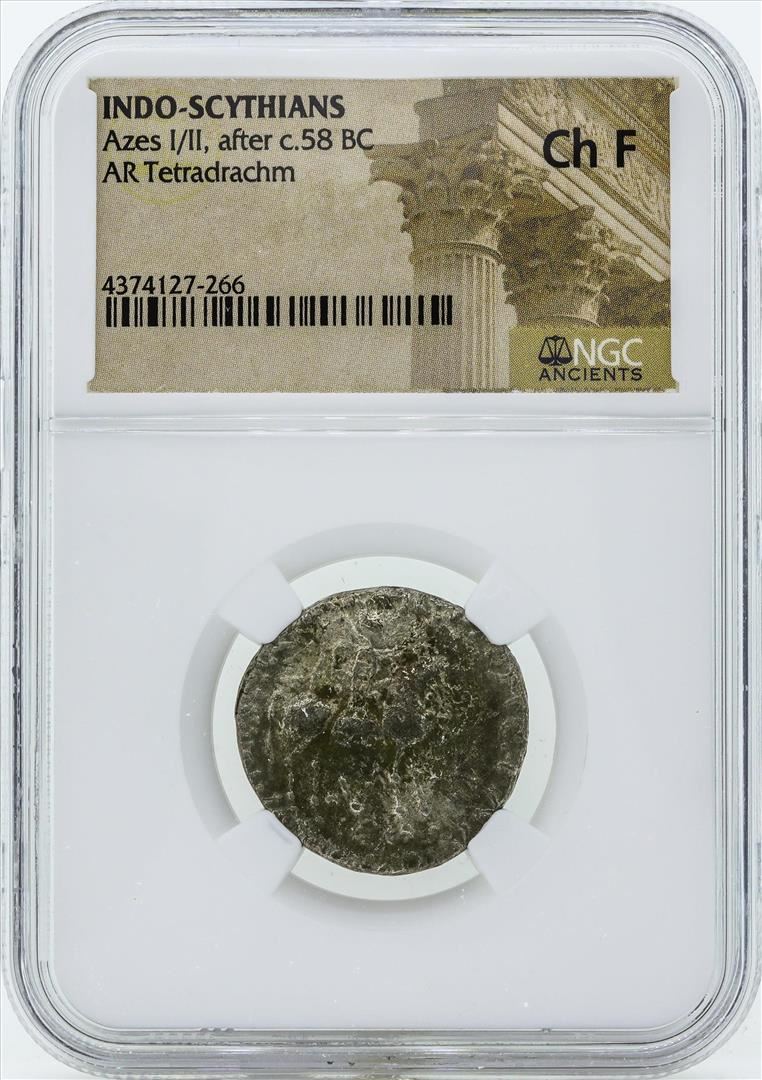 One 58 BC Indo Scythians Azes I/II AR Tetradrachm Coin NGC Ch F. NGC Certified.