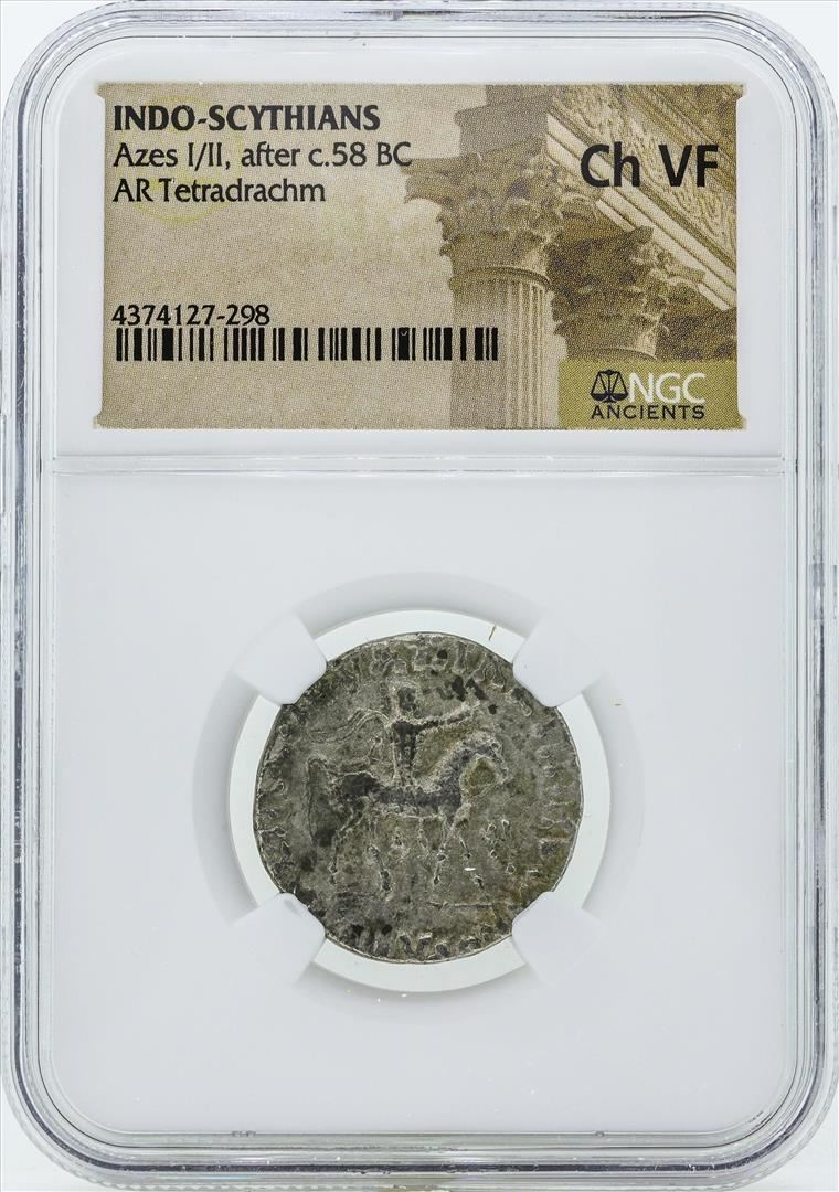 One 58 BC Indo Scythians Azes I/II AR Tetradrachm Coin NGC Ch VF. NGC Certified.