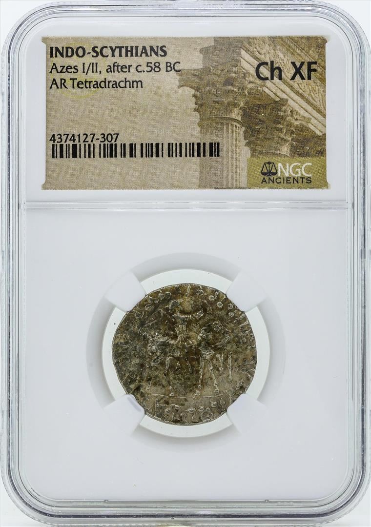 One 58 BC Indo Scythians Azes I/II AR Tetradrachm Coin NGC Ch XF. NGC Certified.