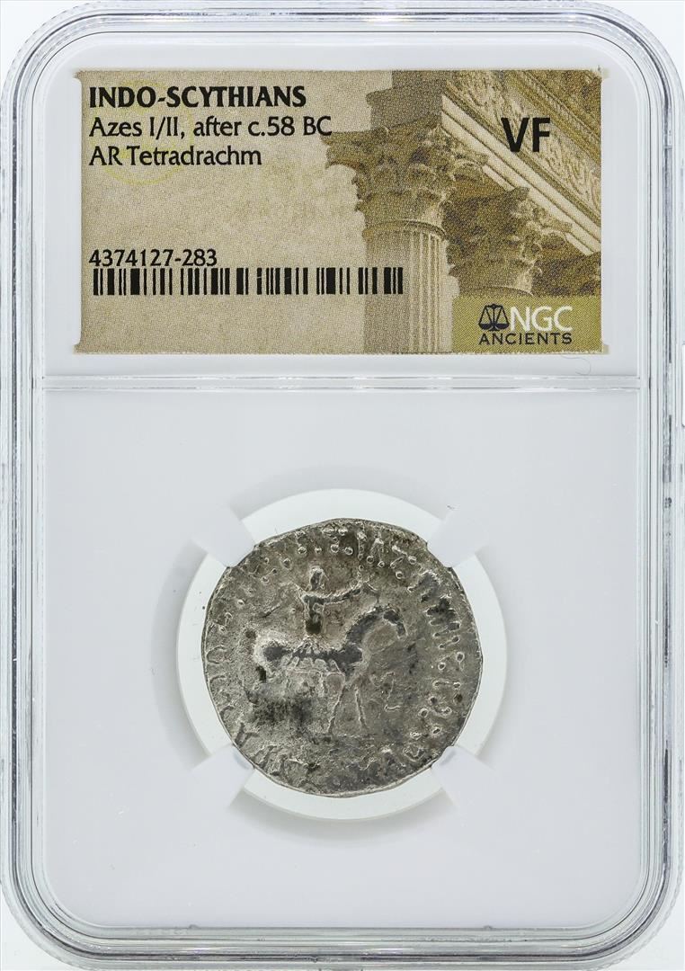 One 58 BC Indo Scythians Azes I/II AR Tetradrachm Coin NGC VF. NGC Certified.