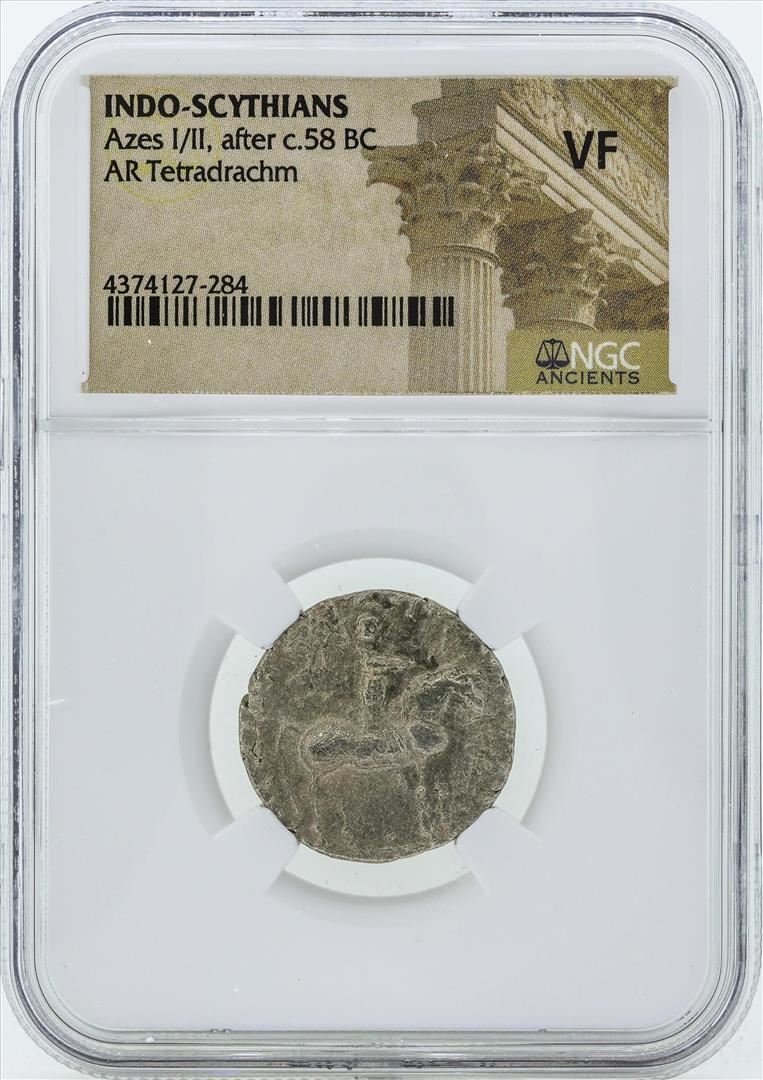 One 58 BC Indo Scythians Azes I/II AR Tetradrachm Coin NGC VF. NGC Certified.