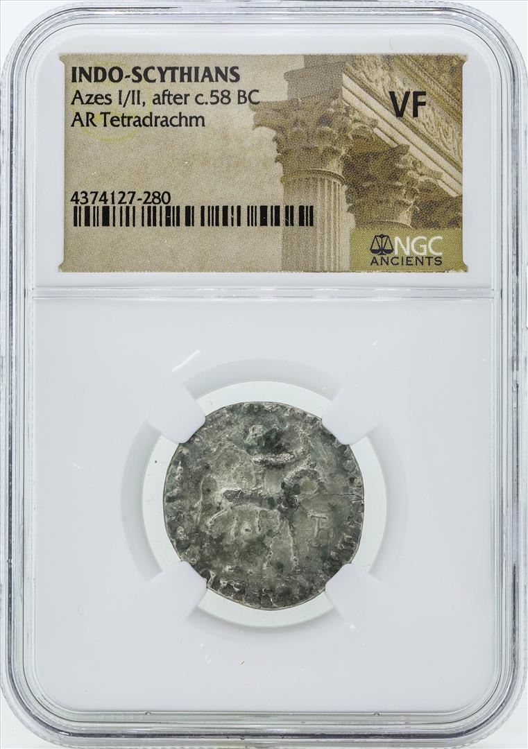 One 58 BC Indo Scythians Azes I/II AR Tetradrachm Coin NGC VF. NGC Certified.