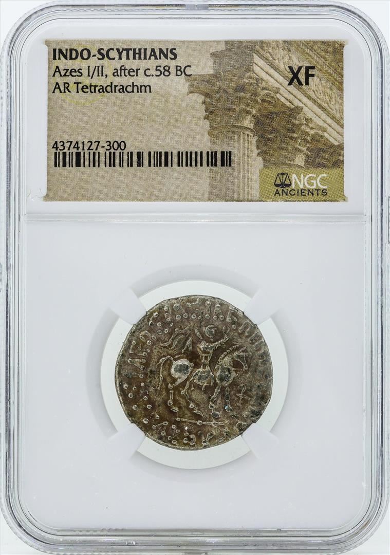 One 58 BC Indo Scythians Azes I/II AR Tetradrachm Coin NGC XF. NGC Certified.