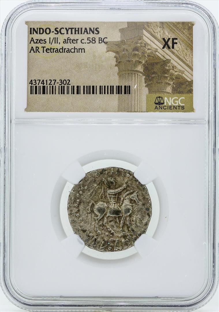 One 58 BC Indo Scythians Azes I/II AR Tetradrachm Coin NGC XF. NGC Certified.