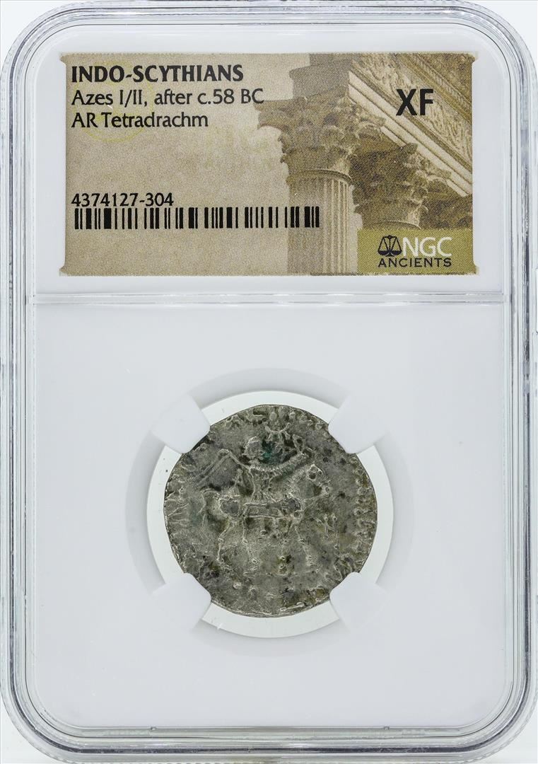 One 58 BC Indo Scythians Azes I/II AR Tetradrachm Coin NGC XF. NGC Certified.