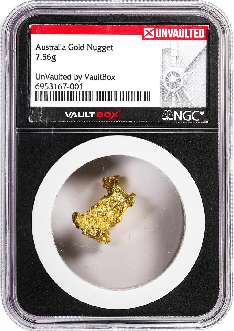 One 7.56 Gram Australia Gold Nugget NGC Vaultbox Unvaulted. NGC Certified.