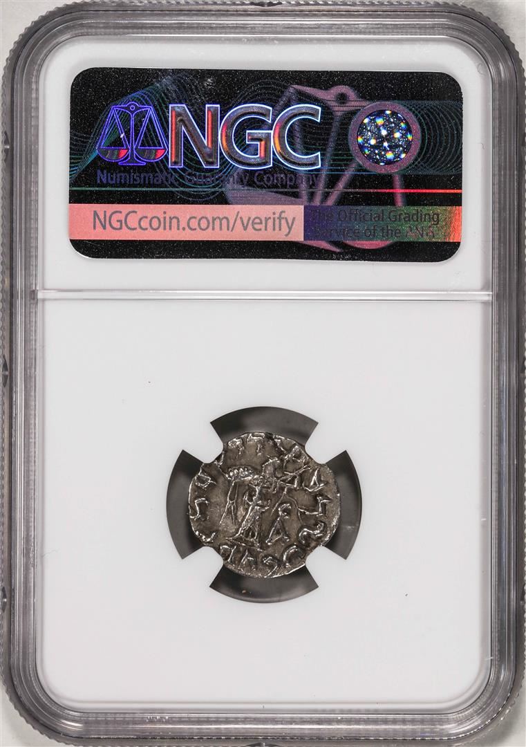 One 80-65 BC Bactria, Indo-Greeks Apollodotus II AR Drachm Ancient Coin NGC Ch XF. Diademed, draped bust of Apollodotus II right / Maharajasa tratarasa Apaladatasa (Kharosthi), Athena advancing left, brandishing thunderbolt in right hand, aegis across outstretched left arm; Kharosthi monogram in inner left field. NGC Certified.