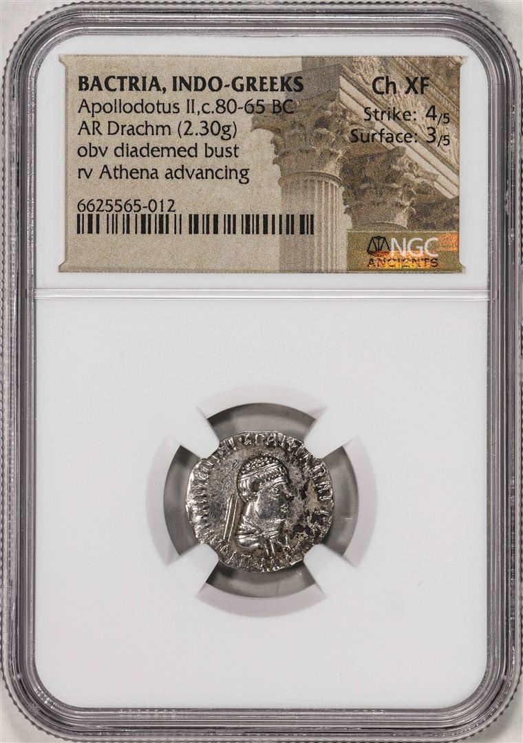 One 80-65 BC Bactria, Indo-Greeks Apollodotus II AR Drachm Ancient Coin NGC Ch XF. Diademed, draped bust of Apollodotus II right / Maharajasa tratarasa Apaladatasa (Kharosthi), Athena advancing left, brandishing thunderbolt in right hand, aegis across outstretched left arm; Kharosthi monogram in inner left field. NGC Certified.