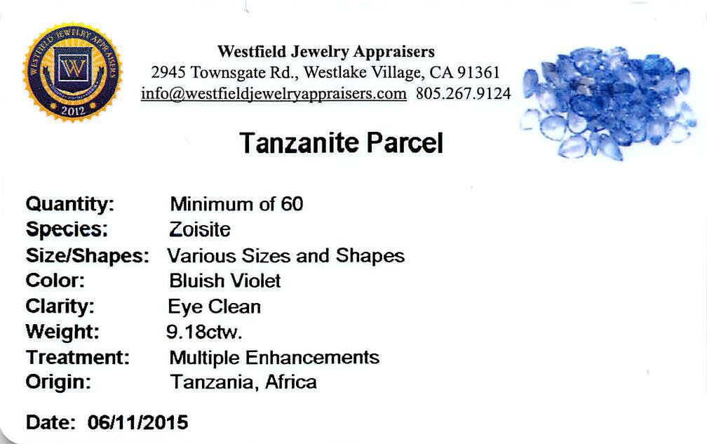 Sixty mixed cut natural tanzanites exact total weight 9.18ctw., clarity is eye clean, type I, medium dark, very slightly grayish, bluish violet color, (GIA bV 6/3), cut is good. Transmitting light with no distortion, transparent. Color grade is an average for the group. Graded in the setting. Tanzanite is a very rare gemstone that is only found in the country of Tanzania. Originally discovered in 1967. Tiffany & Company, named the stone Tanzanite. It is found in the Usumburu Mountains that border the Umba Valley of northern Tanzania. Tanzanite occurs in gray, brown, violet, blue, reddish-purple, & green. The gem is interesting because of its exceptional pleochroism. Rotated in different directions a tanzanite will exhibit multiple changes of color. Tanzanite has a low tolerance to ultrasonic cleaning, and should not be cleaned using this method. UGS Appraised.