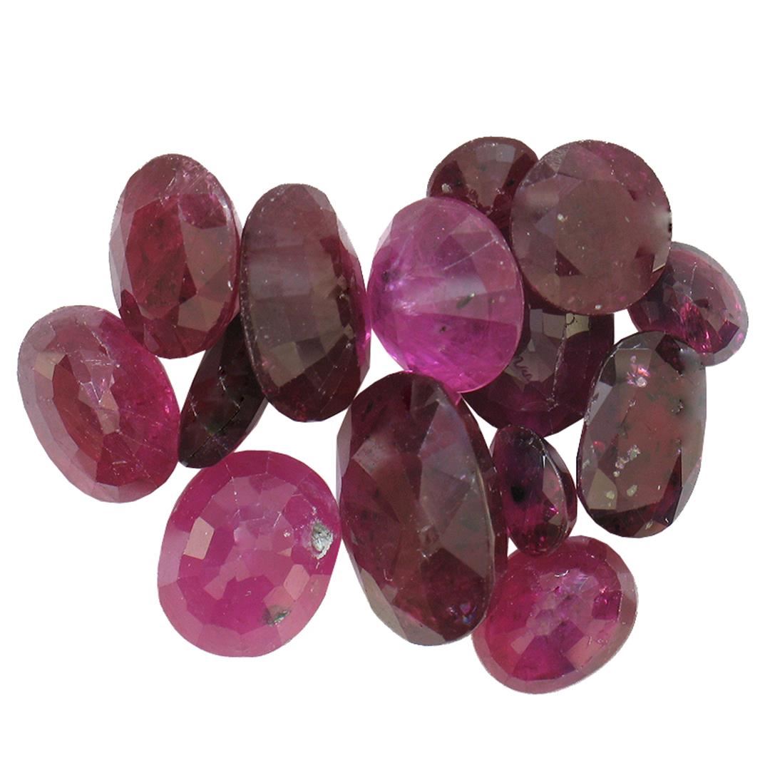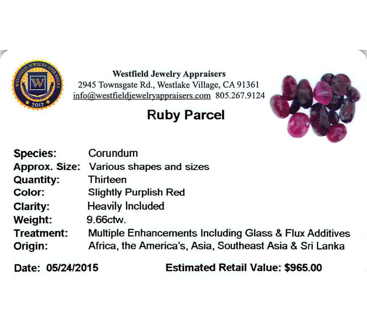 Thirteen various shapes & sizes cut natural rubies exact total weight 9.66ct., clarity is heavily included, type II, dark, very slightly brownish, slightly purplish red color, (GIA slpR 7/3), cut is good. Transmitting light somewhat diffusely, transparent to translucent. Naturally occurring internal & external characteristics are present. Indications of laboratory high temperature heat treatment, with glass & flux additives. Ruby has a low tolerance to rhodium plating, repolishing the surface, & ultrasonic cleaning. UGS Appraised at $965.00.