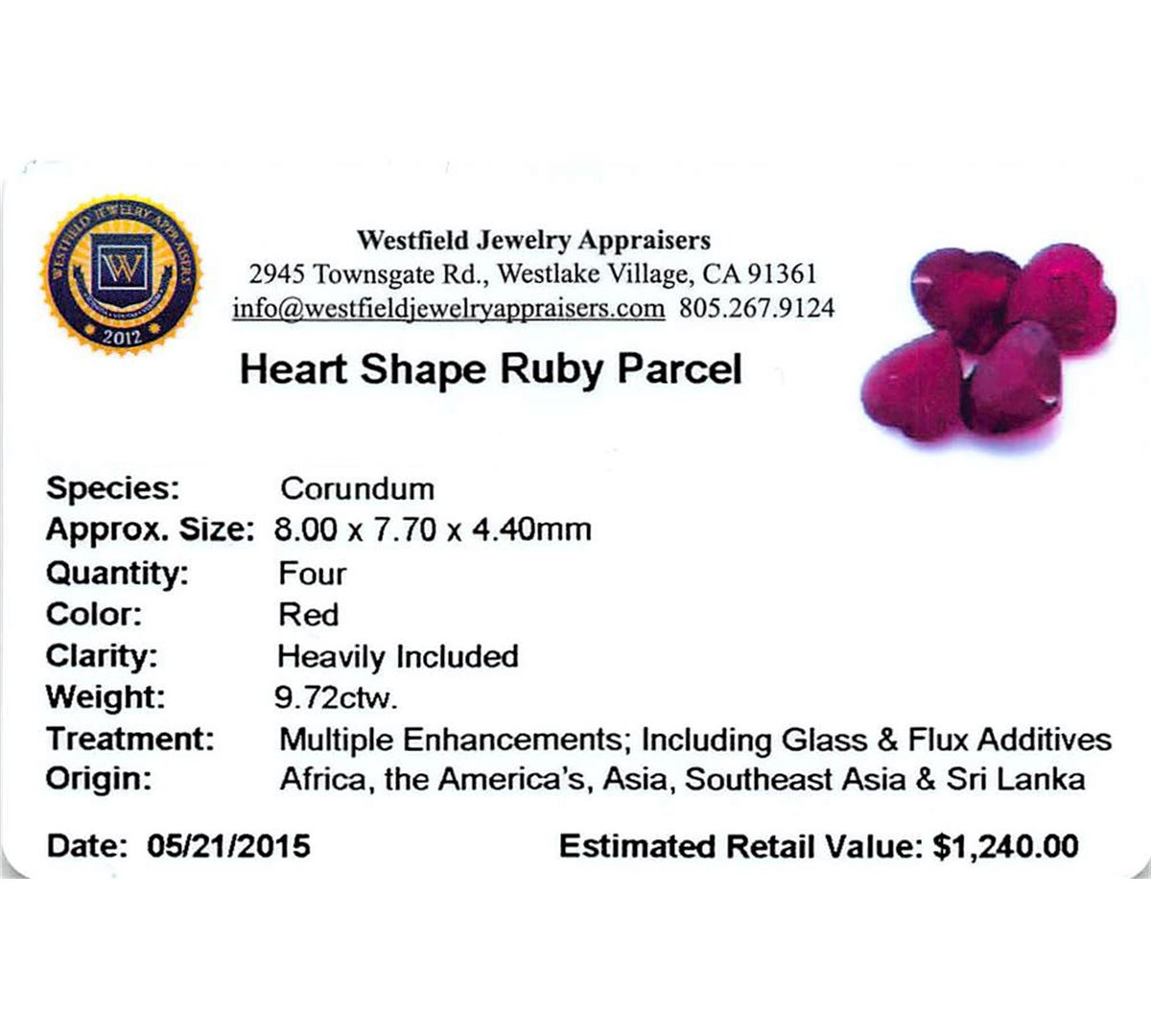 Four heart mixed cut natural rubies, measuring 8.00 x 7.70 x 4.40mm, exact total weight 9.72ct., clarity is heavily included, type II, dark, very slightly brownish, red color, (GIA R 7/3), cut is good. Measurements are an average for the group. Transmitting light somewhat diffusely, transparent to translucent. Naturally occurring internal & external characteristics are present. Indications of laboratory high temperature heat treatment, with glass & flux additives. Ruby has a low tolerance to rhodium plating, & ultrasonic cleaning. UGS Appraised at $1,240.00.