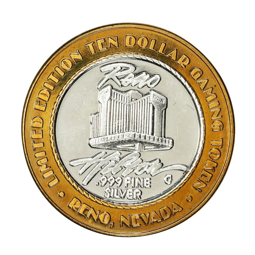 One .999 Silver Hilton Reno Nevada $10 Casino Limited Edition Gaming Token.