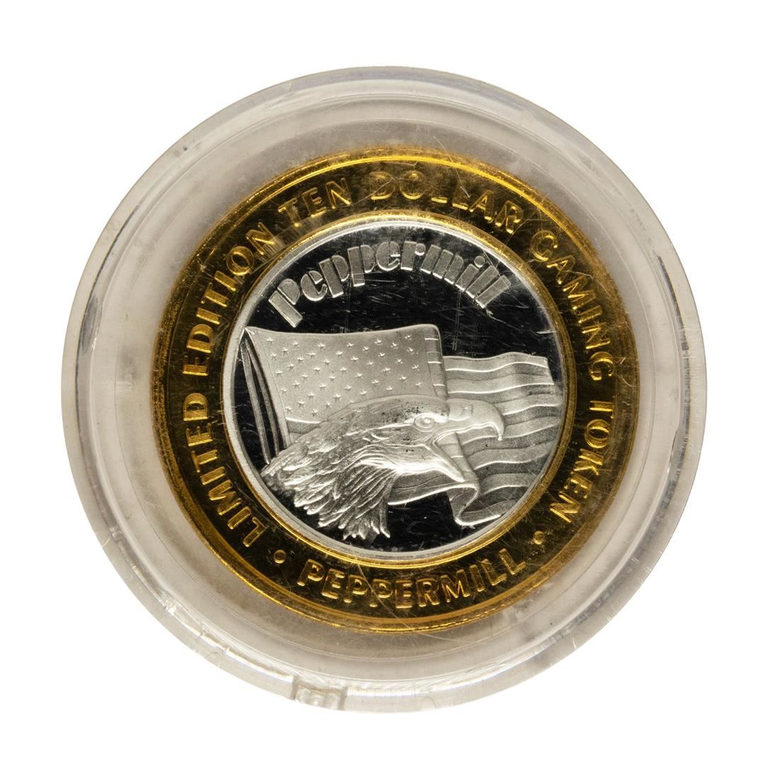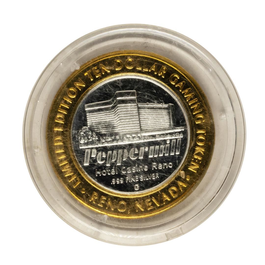 One .999 Silver Peppermill Hotel Casino Reno $10 Casino Gaming Token Limited Edition.