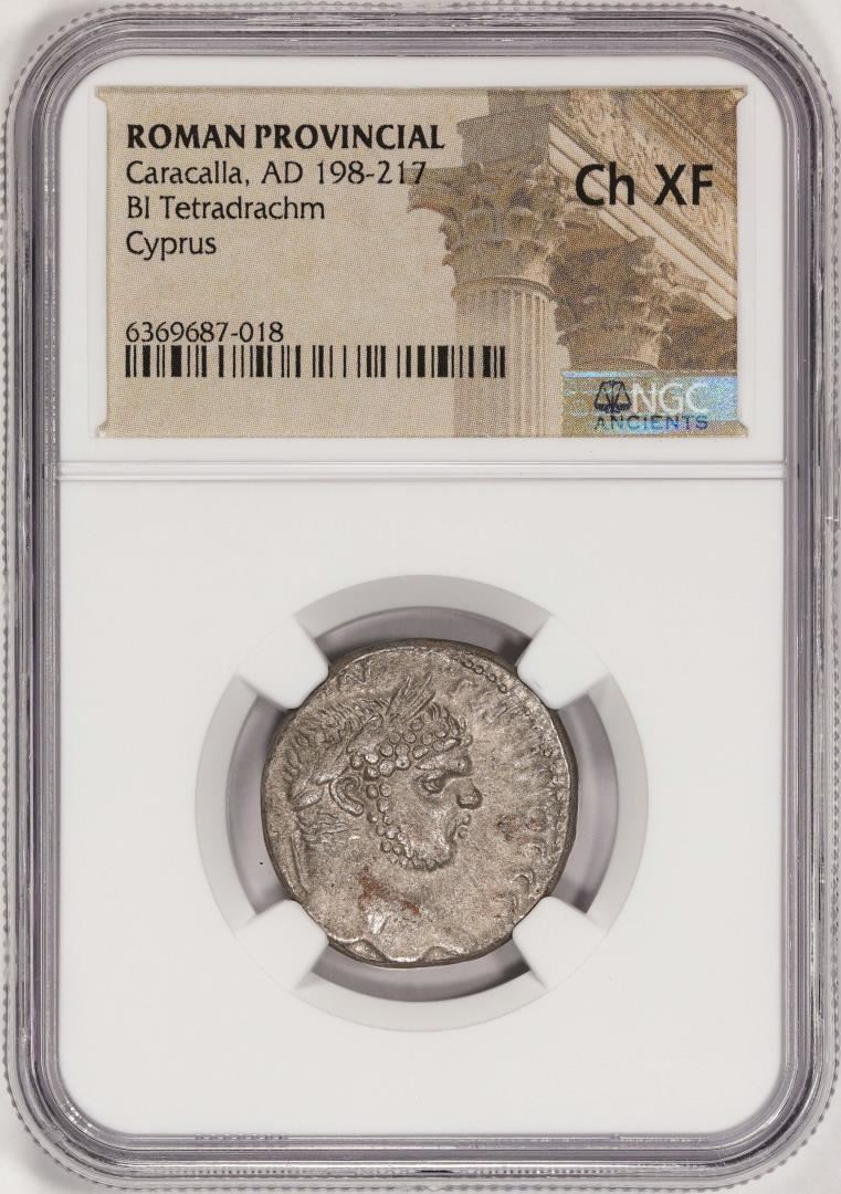 One AD 198-217 Roman Provincial Caracalla Bi Tetradrachm Ancient Coin NGC Ch XF. NGC Certified.