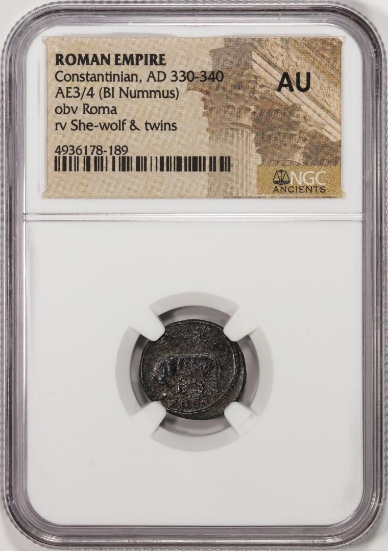 One AD 330-340 Roman Empire Constantinian Bi Nummus Ancient Coin NGC AU. NGC Certified.