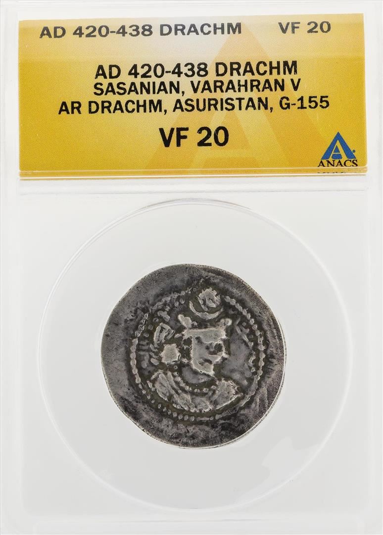 One AD 420-438 Drachm Sasanian Varahran V AR Drachm Asuristan G-155 Coin ANACS VF20. ANACS Certified.