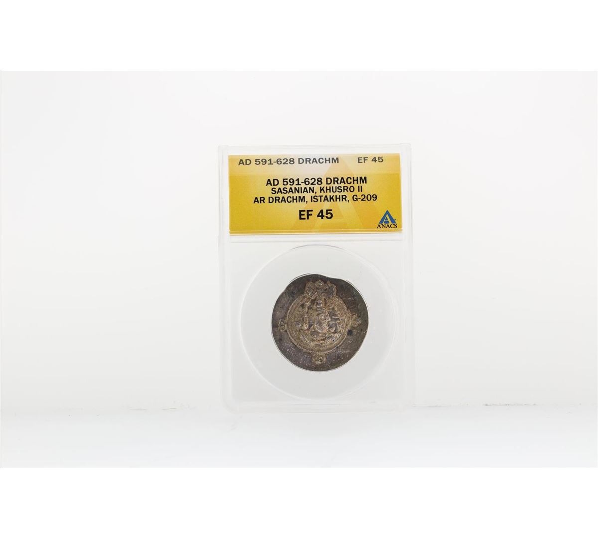 One AD 591-628 Drachm Sasanian Khusro II AR Drachm Istakhr G-209 Coin ANACS EF45. ANACS Certified.