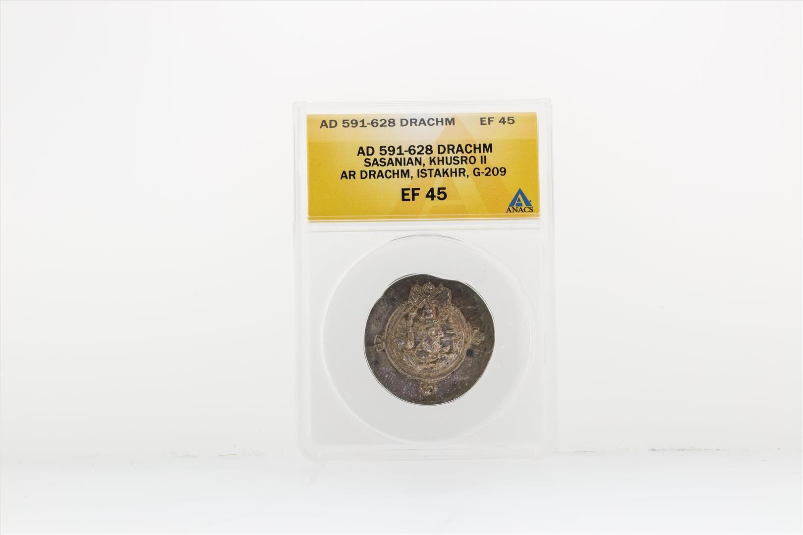 One AD 591-628 Drachm Sasanian Khusro II AR Drachm Istakhr G-209 Coin ANACS EF45. ANACS Certified.