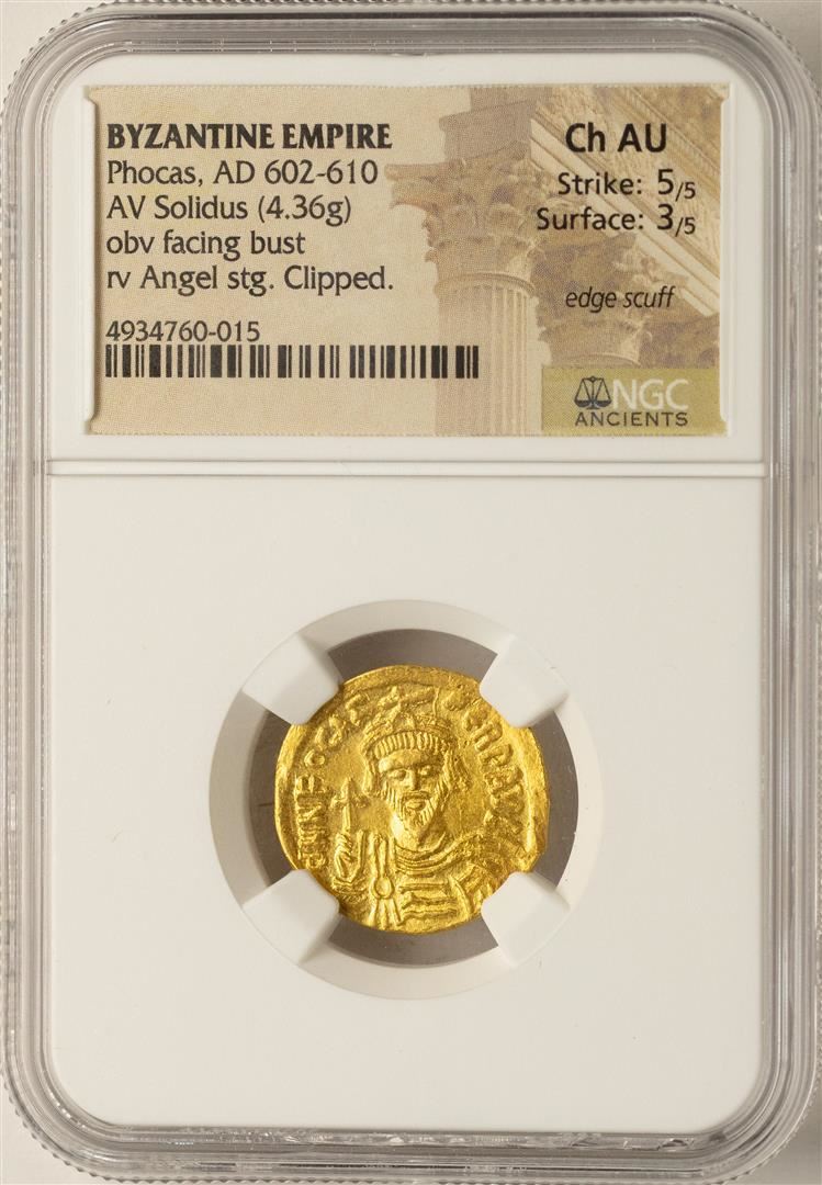 One AD 602-610 Phocas Byzantine Empire Solidus Ancient Gold Coin NGC Choice AU. NGC Certified.