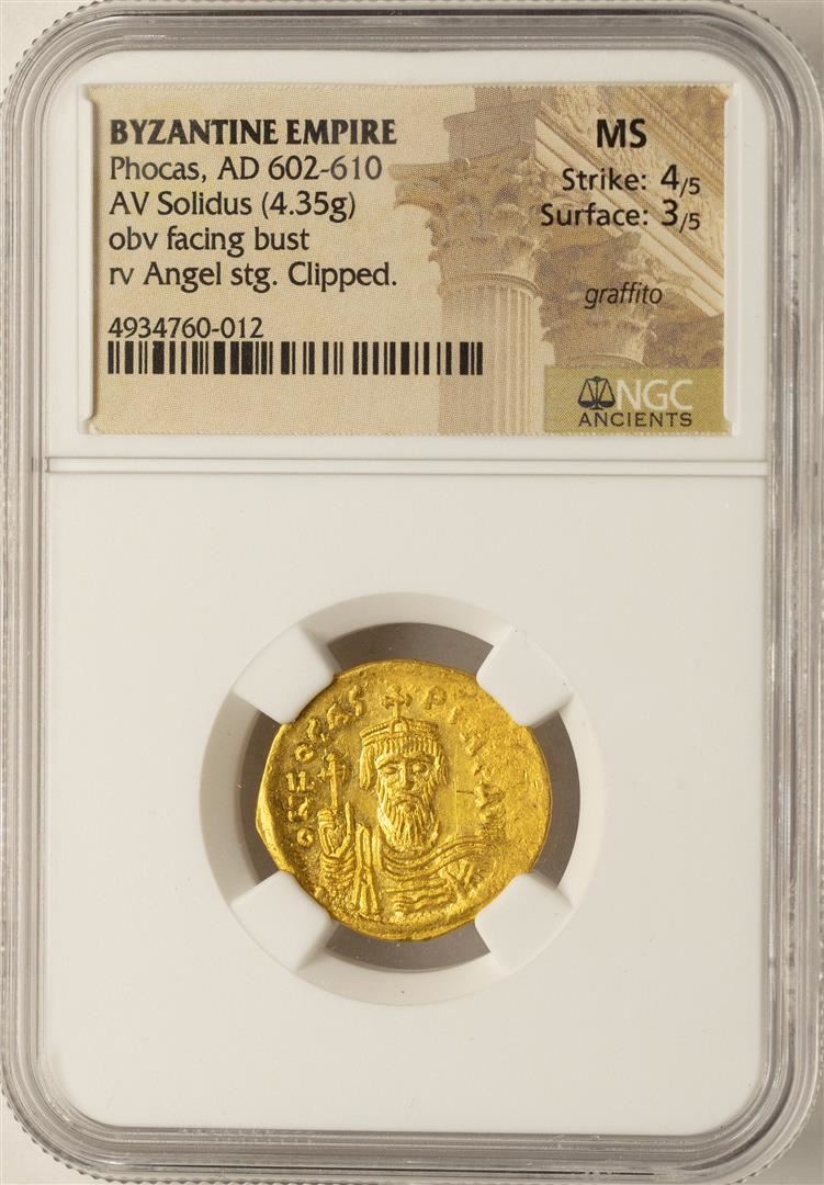 One AD 602-610 Phocas Byzantine Empire Solidus Ancient Gold Coin NGC MS. NGC Certified.