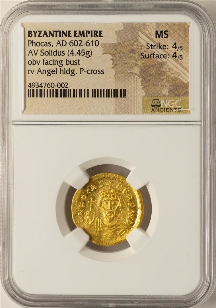 One AD 602-610 Phocas Byzantine Empire Solidus Ancient Gold Coin NGC MS. NGC Certified.