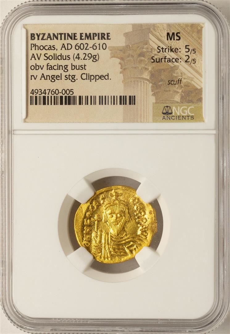 One AD 602-610 Phocas Byzantine Empire Solidus Ancient Gold Coin NGC MS. NGC Certified.