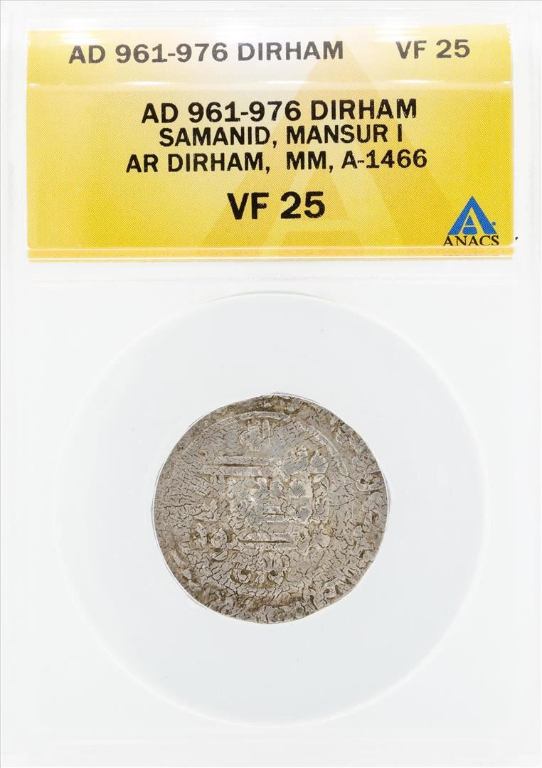 One AD 961-976 Dirham Samanid Mansur I Coin ANACS VF25. ANACS Certified.