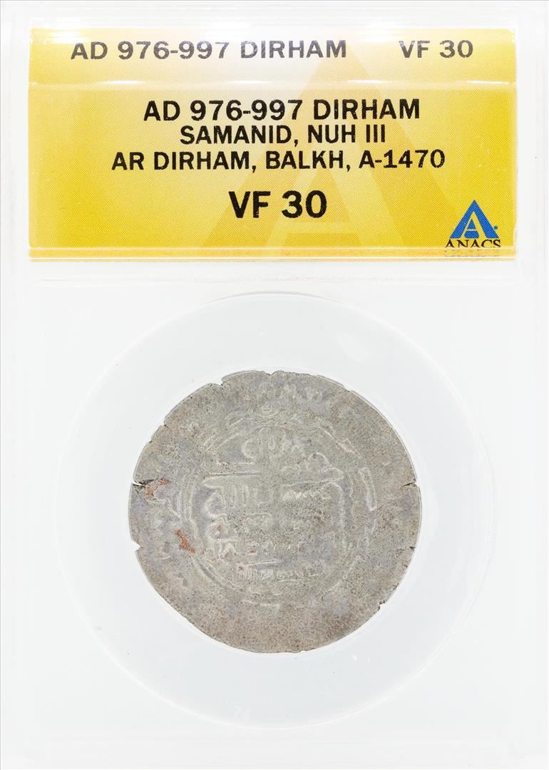 One AD 976-997 Dirham Samanid Nuh III Balkh Coin ANACS VF30. ANACS Certified.