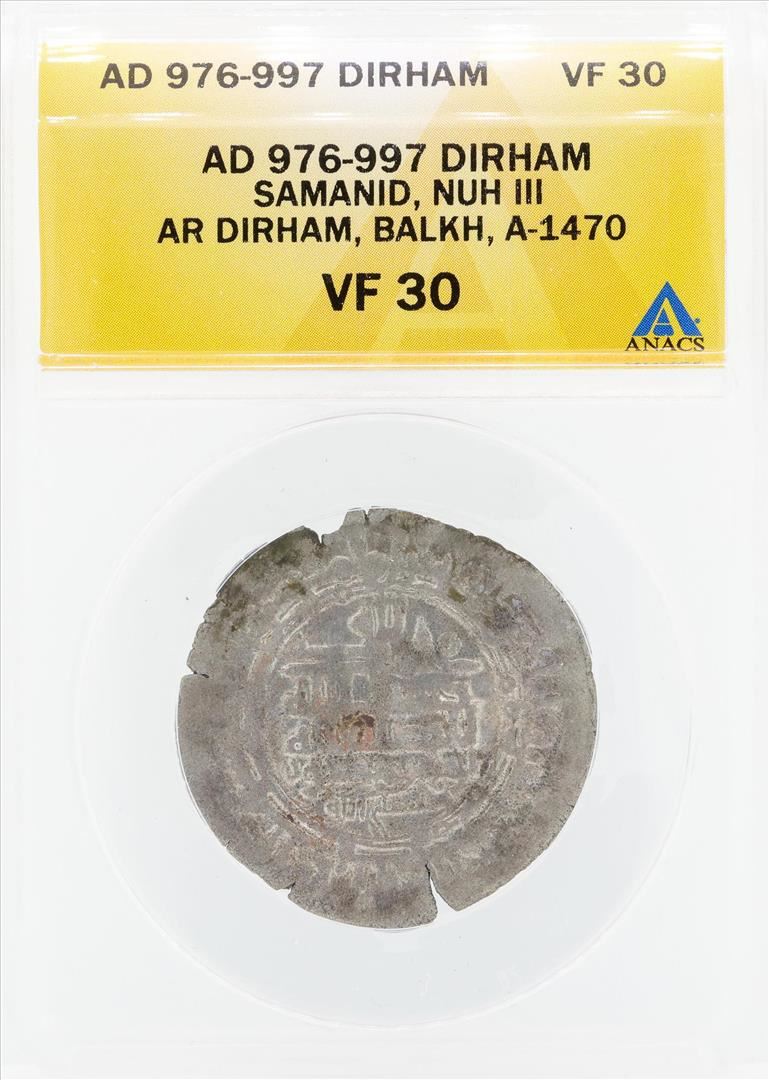 One AD 976-997 Dirham Samanid Nuh III Balkh Coin ANACS VF30. ANACS Certified.