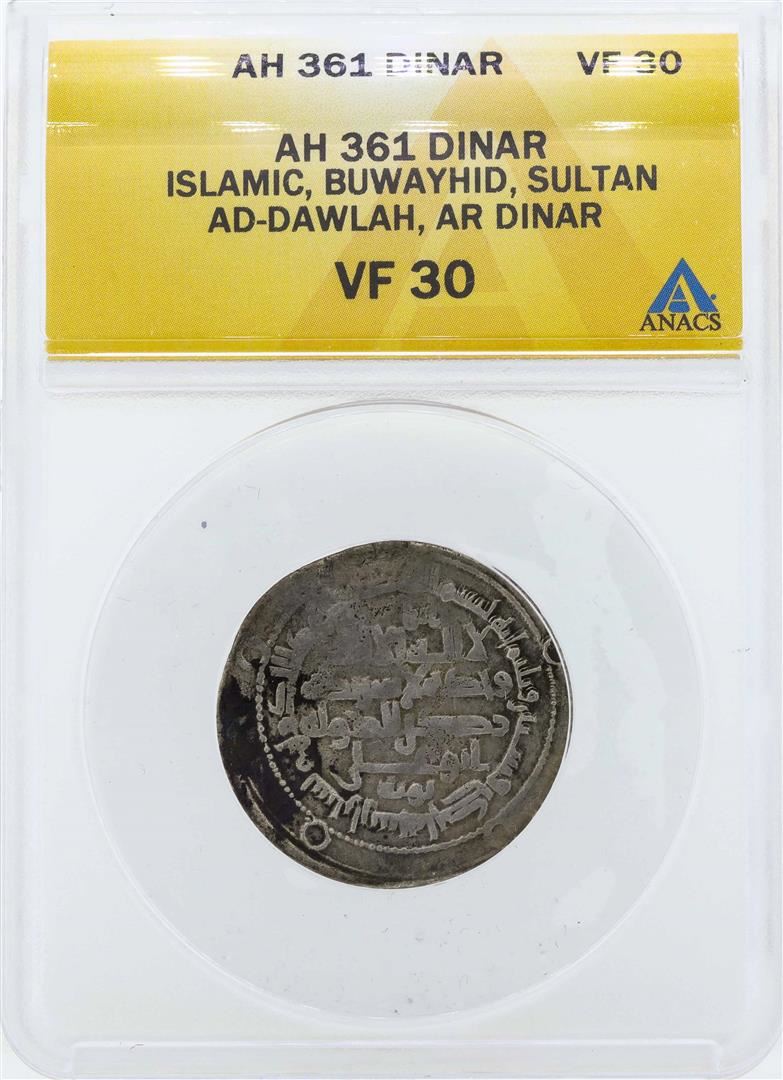 One AH 361 Islamic Buwayhid Dinar Coin ANACS VF30. ANACS Certified.