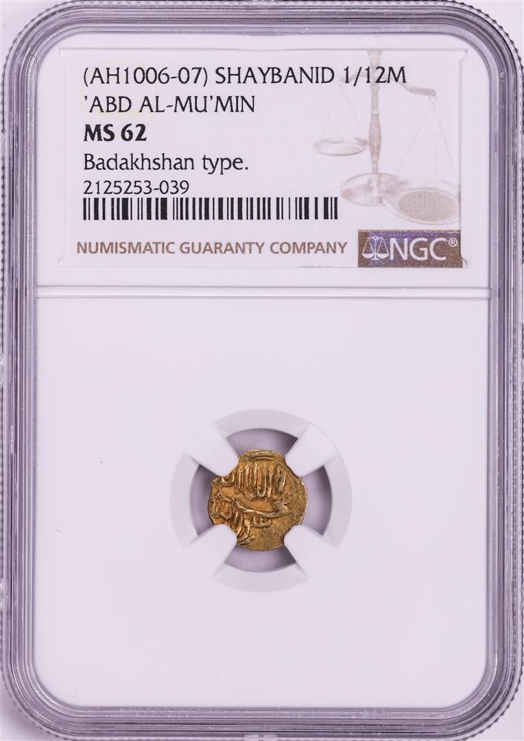 One AH1006-07 Shaybanid 1/12 Mohur 'ABD Al-Mu'Min' Badakhshan Type Gold Coin NGC MS62. NGC Certified.
